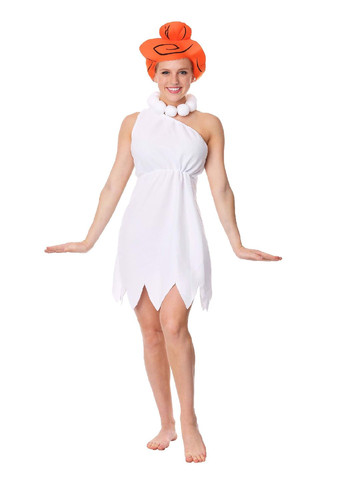 Жіночий карнавальний костюм героїні мультсеріалу "Флінстоуни" - Вілми Флінстоун. Сукня на одне плече має еластичний виріз і пояс. Яскраво-помаранчевий головний убір імітує перуку. Великі пластикові намистини на еластичному шнурі. Склад 100% поліестер. Розмір: S НОГ 47 см, пояс 38 см, довжина 90 см. Виробник Німеччина.