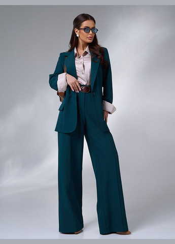 Трикотажний костюм двійка вільного крою. Костюм із широкими прямими брюками на поясній гумці та бічними кишенями. Светр-гольф з коміром-стійкою, довгими рукавами та подовженим кроєм з бічними розрізами. Напівобхват: Кофта: Груди: S (50), M (52), L (54), XL (56), XXL (58), 3XL (60), Довжина виробу 67, Рукав 53, Штани: Талія: S (28-38), M (30-40), L (32-42), XL (34-44), XXL (36-46), 3XL (38-48), Стегна: S (50), M (52), L (54), XL (56), XXL (58), 3XL (60), Довжина виробу 104, Довжина по внутрішньому шву