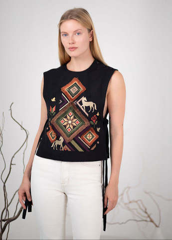 Спереду й ззаду вишивка розміщена дзеркально, але з варіаціями, що надає жилетці художньої динаміки. Бокові зав’язки дозволяють легко регулювати об’єм, підкреслюючи фігуру або залишаючи силует вільним. Ця жилетка — глибокий символ зв’язку з українською культурою, втіленим у сучасній, зручно носибельній формі.