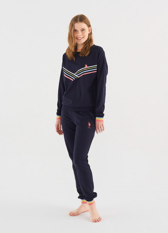 Жіноча піжама U.S. Polo Assn. з індивідуальним дизайном. Верхня частина комплекту - світшот з акцентними різнокольоровими смужками, нижня - зручні штани на манжетах. Модель виготовлено з високоякісних матеріалів, що забезпечує комфорт під час повсякденного носіння.
