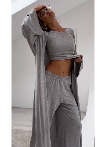 Комфортний та стильний костюм, що поєднує в собі легкість і гармонію. У комплект входить довгий кардиган, лонгслів, який красиво підкреслює талію (на фото представлений у підвернутому вигляді), та штани вільного крою на еластичній резинці. Виріб виконаний із легкої, приємної до тіла тканини, яка забезпечує комфорт протягом усього дня.