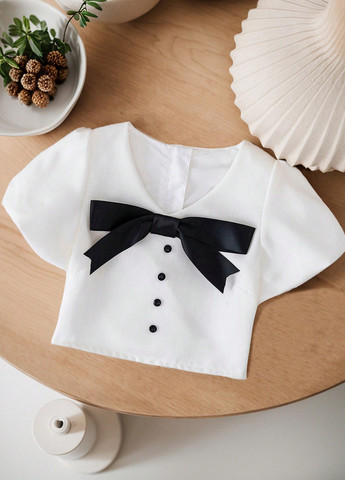 Блуза SHEIN Tween Girls з V-подібним вирізом та бантом. Ця блуза з рукавами-буфами застібається на блискавку ззаду. Рекомендації щодо догляду: ручне прання або професійна хімчистка.