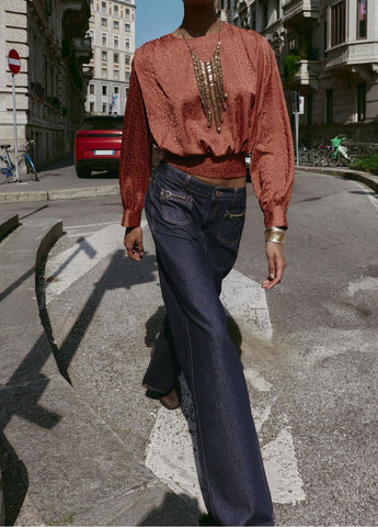 Блузка оверсайз із суміші льону та віскози. Загострений комір, планка на ґудзиках та кокетка зі складками ззаду. Виріз на плечах, широкі манжети на ґудзиках із розрізами та закруглений поділ, злегка подовжений ззаду.