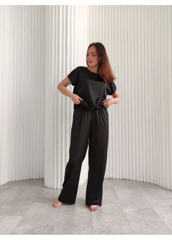 Домашній костюм шовковий. Підійде для домашнього та повсякденного носіння. Брюки прямого крою з двома кишенями та резинкою в поясі. Футболка вільного крою, короткий цивільно кроєний рукав. Модель на фото зріст 170 см