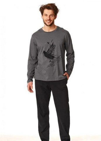 Чоловіча піжама класичної форми. Повністю виготовлений з надзвичайно м'якої, високоякісної бавовняної тканини. 100% натуральне волокно забезпечує тепло і дуже високий комфорт використання. Особливості моделі: - Класичний крій верху та низу; - Кофта з круглим вирізом, з мотивом Чорних Воронів; - Штани зі зручним еластичним поясом на зав'язках; - Глибокі кишені. Модель має зріст 183 см і носить розмір L. Кольори: блуза кольору земляний антрацит з малюнком ворон брюки: чорний колір. Склад в'язки: 100% бавовна. Виробник: Польща.