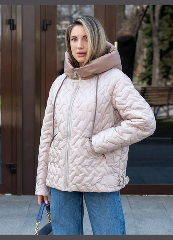 Демісезонна подовжена куртка з капюшоном і поясом в комплекті. Центральна застібка на блискавку, прикриту планкою з кнопками. Виконана із стьобаної плащової тканини, на підкладці, утеплена силіконом 100. Має дві бокові кишені і одну на грудях. Капюшон не знімається. Довжина по спинці 78 см. Довжина рукава від плечового шва 64 см. На моделі 44р (Груди 94 см, стегна 95 см, зріст 173 см)