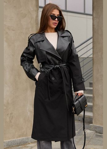 Демісезонний комбінований класичний тренч з еко-шкіри та котону. Англійський комір, двобортний класичний фасон. Модель на підкладці, довжина по спинці 116 см
