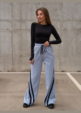 Широкі спортивні штани на поясній гумці, виготовлені зі світло-сірого трикотажу на флісі. Модель високої посадки прямого вільного крою з кишенями та шнурком на поясі. Штани декоровані бічними діагональними смужками. Напівобхват: Талія: S (32-38), M (34-40), L (36-42), XL (38-44), Стегна: S (50), M (52), L (54), XL (56), Довжина виробу - 108, Довжина внутрішнього шва - 78, Тканина: Середньої еластичності