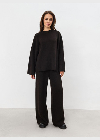 Затишний комплект зі штанів та светру. Костюм вільного силуету. Штани мають комфортну, високу посадку. Светр має широкі рукавчики та асиметричний розріз збоку. Варіант зручного повсякденного костюму, який можна легко доповнити сумочкою через плече та тренчем чи бомбером.