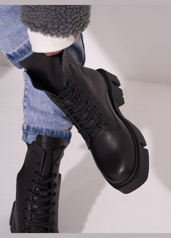 Чорні високі черевики на шнурівці із задньою еластичною вставкою та петлицею. Черевики з натуральної шкіри на хутрі з прямокутним носком на високій підошві та невеликим підбором. Матеріал верху: натуральна шкіра. Підклад: хутро штучне. Підошва: TR (терморезина). Висота підошви: 4,5 см та 3 см. Висота черевиків: 15,5 см. Заміри: 36 (23,5), 37 (24), 38 (24,5), 39 (25), 40 (25,5), 41 (26)