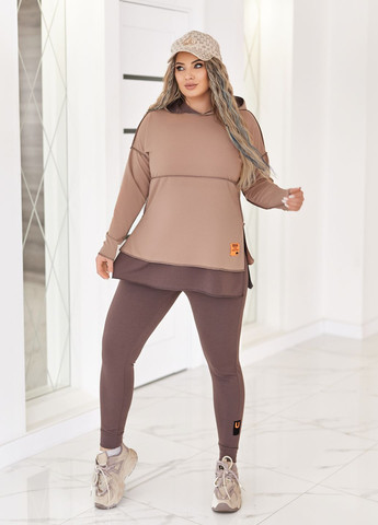 Костюм виготовлений з полегшеної двунитки, яка має гладку фактуру. Тканина має гарну еластичність, враховуйте це під час підбору розміру. Завдяки своєму фасону гарно сідає по фігурі. Худі подовженого крою з довгими рукавами, плечовий шов спущений, що створює вільний силует. Присутній капюшон, оверлочні шви навиворіт та розрізи по боках. Штани приталеного фасону з високою посадкою, талія на гумці та не має застібок. На штанах присутні дві кишені з відрізним бочком. Худі: 50-54 р-р: ОГ 120, ОС 122, довжина худі 73, довжина рукава 70; 56-60 р-р: ОГ 130, ОС 132, довжина худі 76, довжина рукава 71; 62-66 р-р: ОГ 140, ОС 142, довжина худі 80, довжина рукава 75; Штани: 50-54 р-р: ОТ 78-112, ОС 106-120, довжина штанів 92; 56-60 р-р: ОТ 80-116, ОС 112-128, довжина штанів 95; 62-66 р-р: ОТ 90-128, ОС 126-142, довжина штанів 100; Виміри робились по верхній частині готового виробу. ОГ — об'єм грудей. ОТ — об'єм талії. ОС — об'єм стегон.