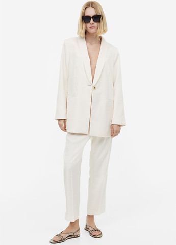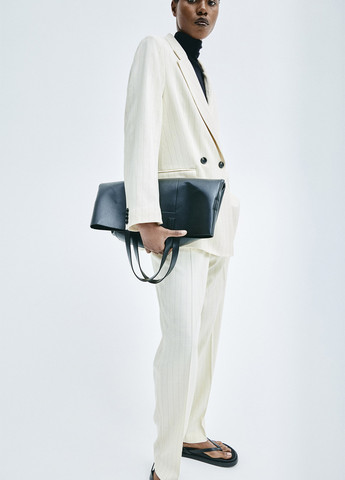 Модель зі звичайною висотою талії та блискавкою з гачком. Похилі бічні кишені та прорізні задні кишені. Тонкі штанини, розкльошені від коліна, з помітними складками. Внутрішня сторона штанини: довжина: 84 см (розмір 40), обхват талії: 77,5 см (розмір 40).