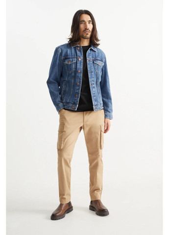 Оверсайз-жакет з саржі з двобортною застібкою, широкими лацканами з вирізом, золотистими ґудзиками спереду та передніми кишенями з клапанами. На підкладці.