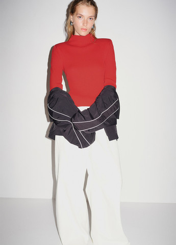 Облягаючий короткий гольф тонкої ребристої в'язки з підплічниками, довгими рукавами та прямим подолом.
