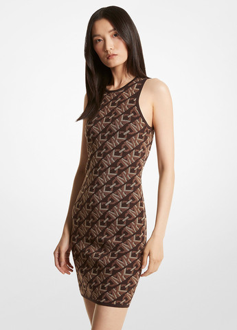 Сукня Michael Kors. Ця сукня з елегантним силуетом створена для того, щоб привертати увагу з витонченою легкістю. Культові ініціали MK надають цій жакардовій сукні відчуття шику. Модель має вузький крій, що підкреслює фігуру.  Воно виготовлене з еластичної віскози в рубчик, що витончено облягає фігуру. Довжина міні. Без рукавів. Круглий виріз. Відмінна якість.