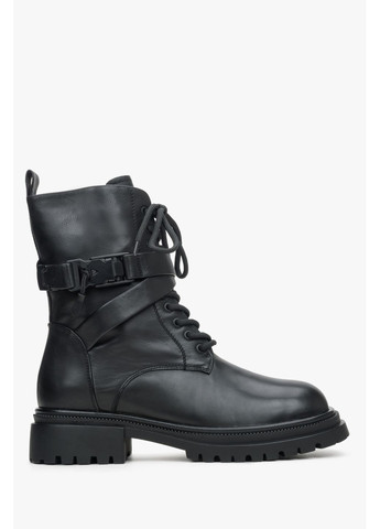 Демісезонні черевики на шнурівках та блискавці. Виконані з грубозернистої шкіри. Використано елегантні сріблясті ґудзики замість верхніх люверсів. Поєднано елементи гламуру та кремезність осінніх трекінгових черевиків.