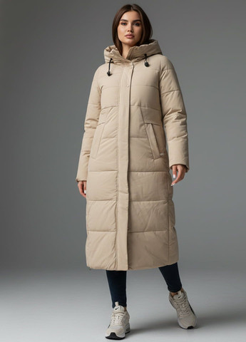 Жіноче пальто пуховик вільного крою з вшитим капюшоном відібраним знімним хутром фарбованого єнота. Так приємно закутатися в м'яке та ніжне хутро та насолоджуватися теплом навіть у найсуворіші морози та сильні снігопад. Основна застібка на блискавці з вітрозахисною планкою. На поличках розташовані кишені. У рукавах є трикотажні манжети, що утеплюють. Підкладка в тон пуховика. До моделі додається пояс. Довжина виробу — 88 см.
