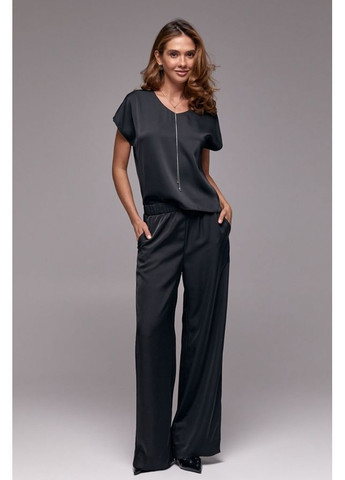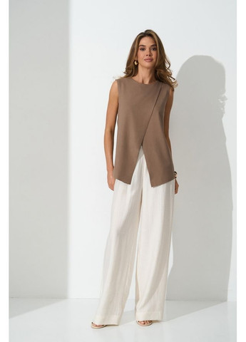 Елегантний літній костюм, що складається із сорочки вільного фасону та штанів палаццо. Виготовлений із легкої, "дихаючої" тканини із додаванням віскози та льону. Матеріал має текстуру з ефектом жатки, гарно драпірується. Штани з високою посадкою. По талії зручна резинка. Практичні кишені в бокових швах. Заміри сорочки: Довжина 70 - 74 см. Ширина 51 - 59 см. Довжина рукава 54 - 57 см + ширина плеча 15 - 18 см. Заміри штанів: Довжина по бічному шву 111 - 113 см. Ширина по талії у спокійному нерозтягнутому стані 35 - 41 см., у розтягнутому стані 41 - 47 см. Ширина у стегнах 50 - 58 см.