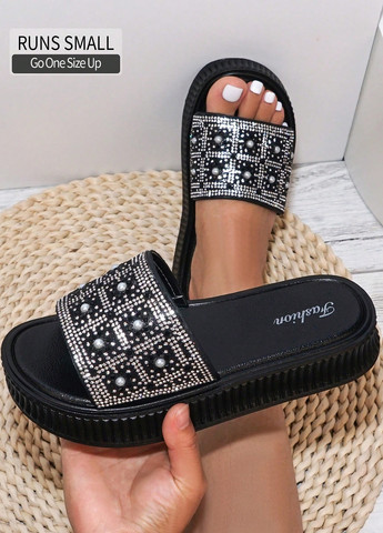 Жіночі літні сандалі. Ці сандалії прикрашені стразами та перлами. У них товста підошва. Підходять для носіння на свіжому повітрі. У сандаль відкритий носок. Підкладка, устілка та верх виконані з ПВХ. Підошва також виконана із ПВХ. Доступний в одному розмірі.