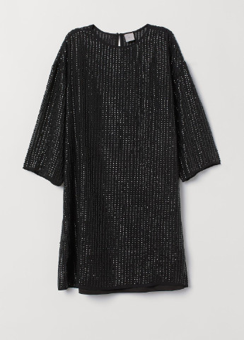 Коротка пряма сукня з повітряного шифону, розшитого паєтками. На сукні круглий виріз горловини та розріз ззаду з потайним гудзиком у горловини. Занижена лінія плеча та рукава середньої довжини. ***Розмір - 32 Довжина виробу – 89,00 см Ширина по плечах – 50,00 см Об'єм грудей - 90,00 см ***Розмір - 34 Довжина виробу – 89,00 см Ширина по плечах – 51,00 см Об'єм грудей - 92,00 см Можливе пошкодження бірки