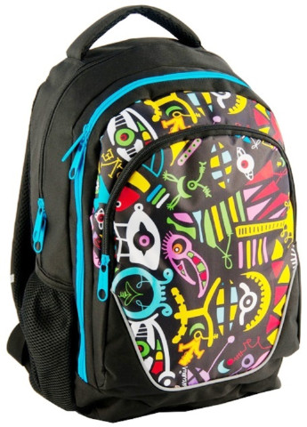 Рюкзак виготовлений з міцної зносостійкої тканини. Лицьову сторону прикрашає яскравий дивовижний принт. Два відділення на блискавці. На передній стінці рюкзака розміщена містка кишеня на блискавці для різних дрібниць. Сітчасті кишені на бічних поверхнях рюкзака. Ергономічні регульовані лямки рюкзака. Щільна сітчаста спинка з м'якими вставками для максимально комфортного носіння. Універсальне використання - в якості міського та / або спортивного. Характеристики: Виробник: Paso, Китай. Країна походження ТМ: Польща. Матеріал: поліестер 600D. Колір чорний. Розміри: 32x44x17 см. Об'єм: 21 л.