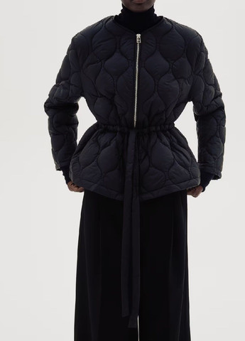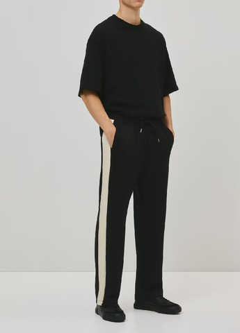 Спортивні штани з тканини скуба середньої щільності з тканими смужками з боків. Еластичний пояс на шнурку, хибна ширинка, кишені в бічних швах та прорізні кишені ззаду. Застібка на таємну блискавку внизу. Вільний крій, що створює невимушений, але не надто вільний силует.