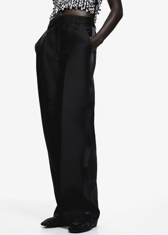 Тканинні штани із застібкою-блискавкою та потаємним гудзиком та гачком. Косі бічні кишені, атласні прорізні кишені ззаду та подовжені брючини з притиснутими складками спереду та ззаду, а також атласними смужками.