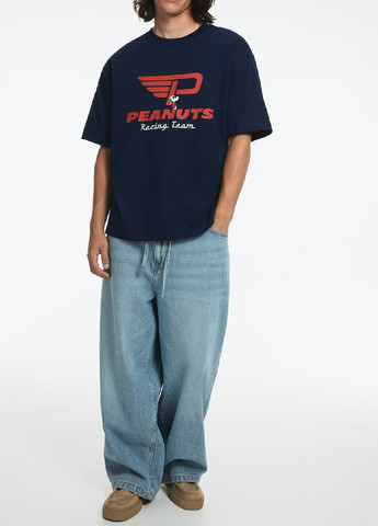 Футболка з принтом із бавовняного трикотажу середньої щільності з круглим вирізом у рубчик, спущеною лінією плеча та прямим нижнім краєм. Вільний крій, вільний, але не об'ємний.