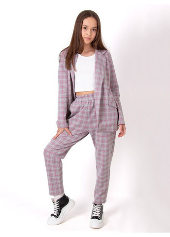 Стильний трикотажний костюм для дівчинки среднього шкільного віку. Виробник - фабрика Mevis, Україна. Піджак прямого крою, злегка подовжений, з кишенями-обманками, спереду застібається на красиві гудзики. Брючки-слоучі з кишенями, пояс на резинці. Склад: 45% бавовна, 38% поліестер, 15% віскоза, 2% еластан. Матеріал - м'який "французький" трикотаж, приємний до тіла і на дотик, відмінно носиться.