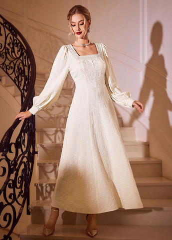 Елегантна vintage сукня для жінок. Це сукня з квітковою жакардовою текстурою та мереживним візерунком. Має квадратний виріз та рукави-бішоп. Сукня має довгий рукав, А-силует з розкльошеним подолом, застібається на блискавку. Тканина не тягнеться. Ідеально підходить для вечірок та особливих випадків.