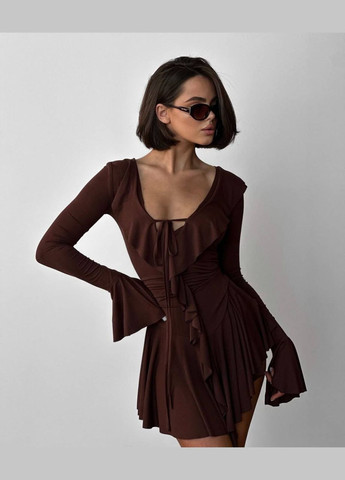 Декорована ніжними воланами по ліфу та спідниці, ця модель виглядає святково й елегантно. Ідеальний вибір для побачення, вечірки, фотосесії або будь-якої події, де хочеться виглядати особливо. Поєднується з босоніжками, чобітками чи балетками — для створення казково жіночного образу.