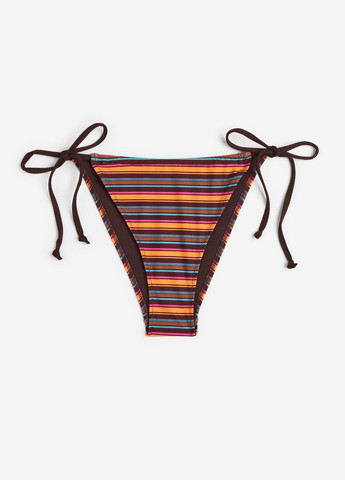 Плавки бікіні на підкладці із середньою посадкою, вузькими зав'язками з боків, високими вирізами на штанинах та середнім ступенем закриття ззаду. Можливе пошкодження бирки