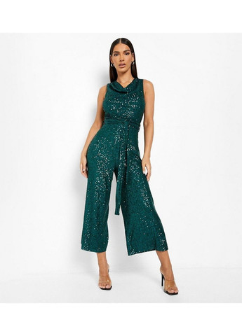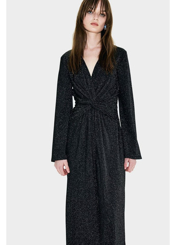 Трикотажний комбінезон з глибоким V-подібним вирізом та потайною застібкою на гачок. Вузол на талії створює ефект драпірування. Довгі рукави та прямі штанини.
