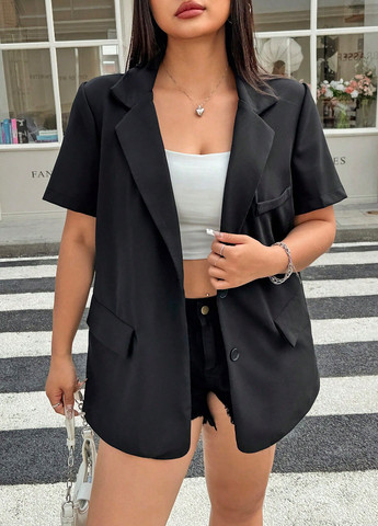 Діловий повсякденний жакет SHEIN EZwear великих розмірів. Цей жакет ідеально підходить для повсякденного ділового носіння. Він має виріз з лацканами та стандартні рукави. Підкладка забезпечує комфорт. Жакет має кишені та застібку на гудзики спереду. Матеріал – трикотажна тканина із суміші поліестеру та еластану. Інструкції з догляду: машинне прання чи хімчистка.