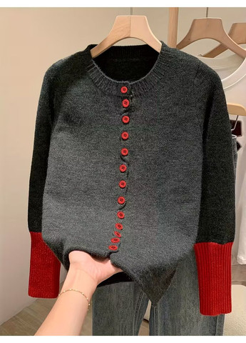 Жіночий осінньо-зимовий светр - кардиган на ґудзиках з червоними акцентними ґудзиками, темно-сірий та червоний колор-блок, машинне прання, светр з довгими рукавами для щоденного носіння, офісу, дому - не товстий шар, офісний одяг, стильний трикотаж, зручний матеріал. Розмір, позначений на товарі, — «Asian L», такий самий, як і UA«42». 86-90cmТалія: 70-74cmСтегна: 94-98cmВисота: 160-165cm.Заміри виробу:Груди: 95 cm, Довжина: 51 cm, Довжина рукава: 58 cm