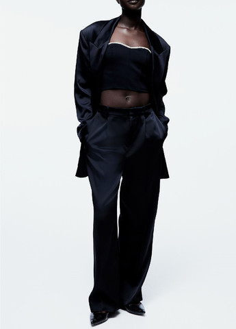 Штани повсякденного крою із тканого матеріалу із завищеною талією, застібкою на блискавку та гачок. Косі бічні кишені, несправжні окантувальні кишені ззаду та прямі брючини зі складками, а також загнутими складками спереду та ззаду. Внутрішня частина штанини: довжина: 75,0 см (розмір 40).