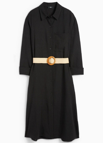 Сукня-сорочка з легкого тканого полотна зі зморшками. Накладна нагрудна кишеня, повна застібка на ґудзиках і дві прорізні кишені. Розріз збоку на подолі та еластичний плетений пояс з круглою дерев'яною пряжкою. Довжина по спинці приблизно 122 см, довжина рукава приблизно 62 см, обхват талії приблизно 110 см в розмірі S; довжина по спинці приблизно 124 см, довжина рукава приблизно 64 см, обхват талії приблизно 118 см в розмірі L; ширина пояса: приблизно 5 см