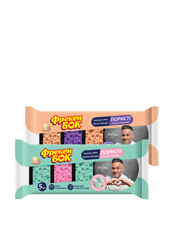 Губки кухонні Фрекен БОК СOLOR - універсальні кухонні губки з крупнопористого поролону, призначені для миття посуду, раковин і кухонних меблів. Особлива структура пір здатна утворювати велику кількість піни навіть із малої краплі миючого засобу. Губки приємні на дотик і дієвіші в чищенні посуду. Пружний поролон не кришиться при висиханні, стійкий до тривалого контакту з водою. Зміцнена зносостійка фібра надійно приклеєна до поролонового шару та допомагає легко очистити складні забруднення. Щоб уникнути розмноження бактерій, кухонну губку рекомендовано міняти щотижня. Більше піни - більше чистого посуду!
