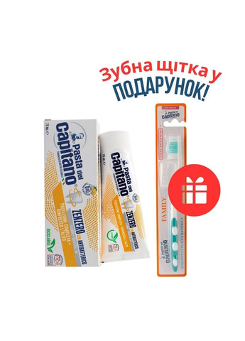 НАБІР: Зубна паста Pasta del Capitano Zenzero (імбир) з антибактеріальним ефектом захищає й освіжає дихання, ідеальна для правильної щоденної гігієни порожнини рота. До складу імбирної зубної пасти Pasta del Capitano входить ексклюзивна молекула на основі цинку Sulfetal Zn. Саме вона гарантує очищення й уповільнення утворення нальоту бактерій, надаючи відчуття свіжості. Зубна паста Pasta del Capitano Zenzero містить цінний інгредієнт — органічний, сертифікований імбир. Це безпечне рішення антибактеріального догляду за зубами, глибокого їх очищення й свіжого дихання для всієї родини. Паста Pasta del Capitano з імбиром, як і всі інші пасти бренду, не містить парабенів, триклозану, лаурилсульфату натрію (SLS) і консервантів формальдегіду. + у подарунок: Зубна щітка Pasta Del Capitano Family Hard ідеально підходить для всієї родини. Жорсткість ворсу дозволяє ефективно прибрати наліт і масажує ясна. Заокруглені щетинки допомагають лагідно очистити наліт без впливу на емаль. Основні характеристики: -висока жорсткість -щетинки заокруглені на кінцях -ергономічна ручка -невеличка і гнучка голівка для кращого проникнення у всі куточки ротової порожнини -до комплекту входить чохол на голівку щітки для захисту від впливу зовнішніх факторів.