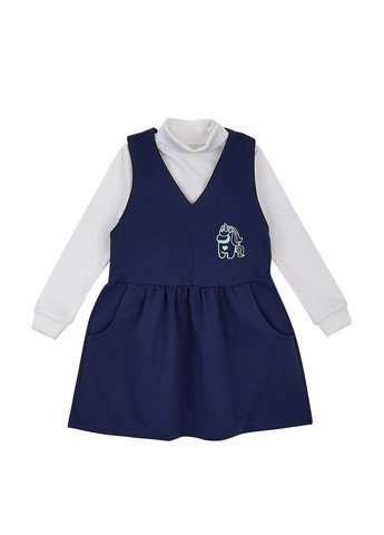 Дитячий костюмчик з сарафану та гольфу. Сарафан з темно-синьої якісної двонитки, яка добре тримає форму навіть після багаторазового прання. На переді маленька світловідбивна наліпка. Сарафан з з еластичною призборкою по лінії таліі, з боковими кишенями на спідниці переда. Горловина та пройми оброблені лампасом з внутрішнього боку. Гольф-водолазка виготовлена з еластичної, м'якенької, дуже приємної на дотик, рібани преміум якості. Висока горловина дозволяє регулювати ширину відвороту як зручніше буде дитині. До 104-го розміру по горловині плечова застібка на кнопки для полегшення надягання, щоб малюк не вередував при продіванні голови. По низу рукавів манжети, що забезпечує щільне прилягання виробу. Низ виробу прямий.
