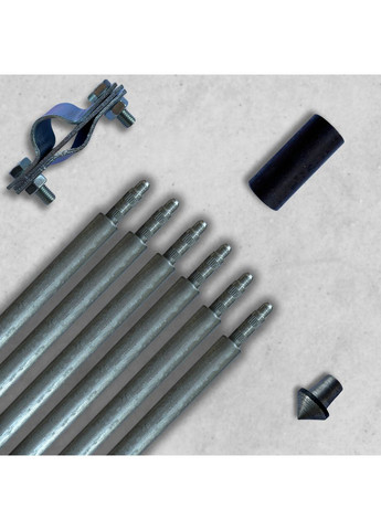Комплект заземлення штирів (шпильок, електродів, стрижнів) заземлення горячеоцинкованих Ø 20 мм заклепувальних (покриття цинку 80-110мкм) Комплектація: 1.Штир заземлення горячеоцинкований заклепувальний Ø 20 мм 1,5 метровий - 6 шт 2.Наконечник для штирів Ø 20 мм - 1 шт 3.Голівка для забивання штирів Ø 20 мм - 1 шт 4.Косий з'єднувач Ø 20 мм і смуги/катанки оцинкованої - 1 шт