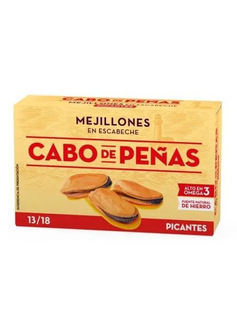 Гострі мариновані мідії Cabo de Peñas – це консервовані морепродукти марки Cabo de Peñas, виготовлені в Іспанії. Вони мають пікантний смак, збалансований кислотність оцту, оливкової олії першого віджиму і суміші спецій. Ці мідії, які традиційно вирощуються на плотах і відбираються на місці видобутку, зберігають свою харчову цінність і продаються в банках чистою вагою 111 грамів і без рідини вагою 69 грамів.