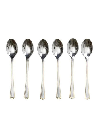 Набір чайних ложок складається з 6 штук, упакованих у блістерну упаковку, що забезпечує зручне зберігання та захист під час транспортування. Ложки виготовлені з високоякісного металу зі сріблястим покриттям, що надає їм елегантного вигляду. Ручки прикрашені золотистими елементами, виконаними в класичному стилі, що надає особливого шарму кожній ложці. Основні характеристики: Кількість предметів у наборі: 6 шт; Кількість персон: 6; Довжина: 15.3 см; Матеріал: нержавіюча сталь; Упаковка: пакет. Розмір кожної ложки оптимальний для використання під час чаювання, а також підходить для десертів або легких закусок. Легко чиститься, що робить їх практичними для щоденного використання. Класичний дизайн підходить для різних інтер'єрів, додаючи вишуканості столовим приборам. Для догляду за виробом рекомендується використовувати м'які мийні засоби, що не пошкоджують покриття. Після миття краще витирати ложки насухо, щоб зберегти їхній блиск і продовжити термін служби.