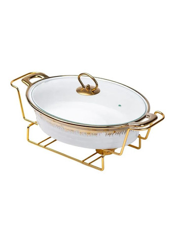 Представляємо вишуканий марміт, який створений для "вау-ефекту" на вашому святковому столі. Це ідеальне рішення для подачі гарячих страв, що поєднує в собі елегантність та практичність. Конструкція складається з трьох частин: Керамічна чаша: Глибока, овальна чаша з білої кераміки, в якій страва виглядає особливо апетитно. Скляна кришка: Прозора кришка зі скла дозволяє гостям бачити вміст, зберігаючи при цьому тепло та аромат. Металева підставка: Елегантна підставка з металу золотого кольору не лише піднімає блюдо над столом, але й, ймовірно, має місце для свічки-таблетки (не входить в комплект), щоб підтримувати температуру страви протягом усього вечора. Характеристики марміту: Тип: Марміт (блюдо для підігріву); Матеріал марміту (чаші): порцеляна; Матеріал кришки: Скло; Матеріал підставки: Метал; Габарити чаші (ДхШхВ): 28 x 23.5 x 7 см; Вага: 3 кг; Об'єм: 2 л. Цей марміт ідеально підходить для подачі жульєну, рагу, запіканок або будь-яких інших гарячих закусок, перетворюючи звичайну вечерю на урочистий банкет.
