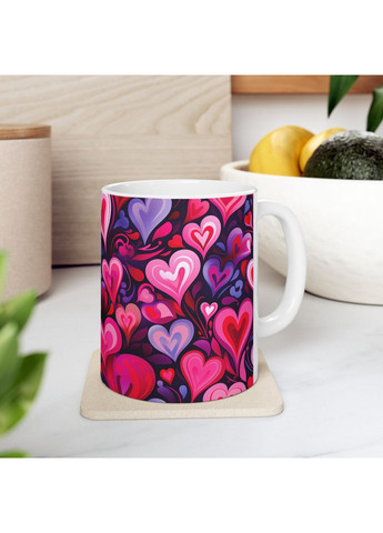 Ця елегантна керамічна чашка має яскравий і привабливий дизайн з абстрактними серцями, виконаними в червоних, рожевих і фіолетових відтінках на темному тлі. Кожне серце складається з декількох шарів, створюючи ефект глибини і об'ємності. Малюнок поєднує різні відтінки і форми, створюючи динамічний і романтичний вигляд. Така чашка буде ідеальною для подарунка або для власного використання, додаючи теплоту і емоційний заряд до кожного напою. Матеріал: Кераміка. Має гладку глянцеву поверхню, яка легко очищається і підходить для щоденного використання. Особливості: Об'єм: 330 мл Ідеально підходить для великої порції кави, чаю або будь-якого іншого улюбленого напою. Рекомендації щодо догляду: Для забезпечення тривалого використання рекомендується мити вручну, хоча чашка також підходить для миття в посудомийній машині. Ідеальний подарунок: Ця чашка стане чудовим подарунком для тих, хто любить барвисті та оригінальні предмети побуту. Вона підходить для будь-якого віку і буде приємною несподіванкою для друзів і родичів.