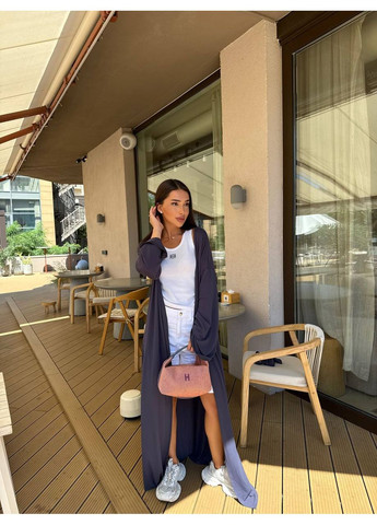 Накидка-кардиган у цьому сеті додає особливої елегантності та завершеності. Її широкий рукав і подовжений фасон роблять образ вільним і невимушеним, надаючи йому відтінку витонченого casual-шику. Такий верх легко можна носити як у комплекті, так і окремо з іншими речами гардероба.