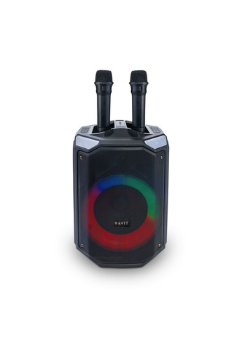 Портативна колонка HAVIT HV-SQ143BT 40W RGB Black має потужність 40Вт. Вона сумісна з AUX, USB, FM, BT, TWS, Micro SD, RGB, MIC IN. Має функцію RGB підсвітки, 4 світлові режими, режим радіо, ефекти басу, ехо і високих частот. Також передбачена можливість зміни стиля звуку завдяки режимам Flat (нейтральний), Jazz, Pop, Rock, Classical. В комплект разом із колонкою входить пульт дистанційного керування, 2 бездротових мікрофона, зарядний кабель USB-C, аудіо кабель, інструкція користувача та гарантійний талон. 1. Підключення колонки до інших пристроїв 1.1. Увімкніть колонку. Для цього достатньо натиснути й утримувати кнопку живлення. 1.2. Ввімкніть Bluetooth на гаджеті, який хочете підключити, знайдіть на ньому пристрій «HAVIT SQ143BT» і з’єднайте колонку з вашим гаджетом. При успішному підключенні ви почуєте звуковий сигнал. Після повторного з’єднання колонка автоматично підключатиметься до останнього під’єднаного пристрою. 2. Відтворення музики 2.1. Для відтворення/зупинки відтворення аудіофайлу короткочасно натискайте кнопку «Play/Pause». 2.2. Для збільшення рівня гучності короткочасно натискайте «+», а для зменшення – «-». 2.3. Натискайте і утримуйте кнопку «Next Song» для відтворення наступного файлу, а «Previous Song» – для відтворення попереднього. 3. Режим радіо 3.1. Для входження в режим радіо короткочасно натисніть кнопку «Mode». 3.2. Для початку автоматичного пошуку радіостанцій короткочасно натисніть кнопку «Play/Pause». Обирайте потрібну станцію за допомогою кнопок «Next Song» та «Previous Song». 4. Управління іншими функціями колонки 4.1. Для зміни режимів короткочасно натискайте «Mode Button», допоки не виберете потрібний режим (BT, FM, USB, Micro SD, AUX). Щоб колонка змогла відтворити аудіофайли з карти Micro SD або USB флешки, достатньо їх вставити у пристрій. Гаджет до колонки можна також підключити за допомогою укомплектованого аудіо кабелю. 4.2. Змінюйте режим підсвітки натисканням «Light Button». 4.3. Гучність мікрофона регулюється за допомогою ручки налаштування «Microphone Volume», ефект ехо – «Echo Knob», ефект високих частот – «Treble Knob», ефект басу – «Bass Knob». 5. Підключення двох колонок SQ143BT (режим TWS) Ввімкніть колонки. Підключіть одну з них до вашого гаджету через Bluetooth, для іншої – активуйте режим бездротового з’єднання. Натисніть та утримуйте на обох колонках одночасно кнопку «Play/Pause». Рекомендації та застереження: - Заряджайте колонку при потужності не більше, ніж 5В, 2А і комплектним кабелем USB-C. - З часом ємність акумулятора зменшуватиметься внаслідок використання колонки та її заряджання. - Під час заряджання індикатор живлення світиться червоним, а при завершенні заряджання червоне світло зникає. - Уникайте потрапляння рідини на виріб. - Тримайте колонку подалі від джерел тепла. - Не блокуйте порти пристрою. - Використання максимального рівня гучності протягом тривалого часу може негативно вплинути на слух та термін служби пристрою. - Не піддавайте механічним пошкодженням і не розбирайте виріб. Гарантійний термін виробу – 1 рік. Характеристики: Потужність 40W Вхідний струм DC 5V/2А Вхідна напруга 5V Підсвічування RGB Інтерфейс Bluetooth V5.0 Радіус дії 10м (без перешкод) Сумісність AUX, USB, FM, BT, TWS, TF, RGB, MIC IN Діаметр динаміка 8'' Час роботи 8-9г Матеріали PP + залізна сітка Гарантійний термін 1 рік Живлення USB-C Час відтворення 9г Аудіо входи AUX, Mic Батарея 7.4V/5400mAh Час заряду 2-3г Колір Чорний Вага 4.2кг Габаритні розміри 266mm x 266mm x 369mm