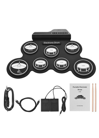 Електронні барабани – це новий формат музичних інструментів, які припадуть до душі дорослим та дітям. За звучанням гнучка електронна ударна установка повністю відповідає повноцінній. Барабанна установка не має вбудованих динаміків, їх потрібно підключати до колонки для досягнення потужного звучання або навушників, щоб не заважати оточуючим. Електронний барабан має наступні педи: малий барабан (snare drum), хай-хет (hi-hat, high-hat), том-том, підлоговий том (high, low tom-tom), великий бас-барабан (bass drum), тарілки краш і райд (crash cymbal, ridecim). Одна барабанна педаль використовується для ігор та «закриття» хай-хет, друга – для ударів по бас-барабану (бас-бочці). Завдяки своїй конструкції барабани дуже мобільні та займають мало місць, їх зручно зберігати та носити із собою. Якщо вам потрібно грати на барабанній установці на вулиці або парку, можна використовувати дві пальчикові батарейки типу ААА (немає в комплекті). Також можна використовувати провід із звичайним роз'ємом USB (його можна підключити до будь-якого USB-порту, наприклад, до комп'ютера, телевізора, телефонного зарядного пристрою або павербанку). Тренуйте координацію, почуття ритму, відчувайте драйв та яскраві емоції від гри на ударній установці. Характеристики: Рознімання: Джек 3,5 мм для підключення колонок або навушників. Джек 3,5 мм для підключення гаджета, що дозволить одночасно відтворити гру на барабанах і звук з телефону роз'єм для підключення USB-кабеля роз'єм для підключення педалей Колір: чорний + білий Теми ударної установки: POP, Rock, Latin, Electro, Percussion Демо-композиції: важкий рок, фанк, свінг-хай-хет, оптимістичний рок Джерело живлення: USB-кабель (у комплекті) або 2 батарейки AAA (у комплект не входять) Розмір елемента: 43*28*2,7 см Вага: 455 г Комплектація: комплект педалей (хай-хет та бас-бочка), USB кабель, аудіокабель