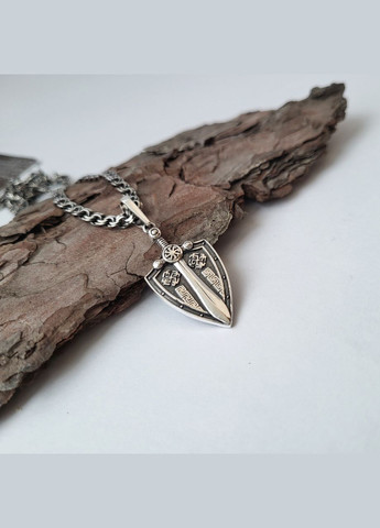 Підвіска Щит із Мечом Срібло 925 проби Чорнене срібло вага 4.40г Довжина з вушком 40 мм Розмір щита 17 × 25 мм виробництво Україна На всіх ювелірних виробах стоїть проба намету України, що підтверджує матеріал виробу — і законність їх реалізації на території України та іменник виробника, який гарантує відповідність ювелірних виробів вимогам ГСТУ 3527-97 "Виробу ювелірні з дорогоцінних матеріалів