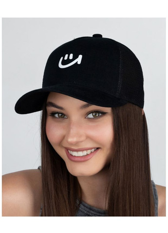 Тип: Жіноча бейсболка-трекерка Розмір: 56-59 см (регульований) Колір: Чорний Форма: П'ятиклинка Матеріал переду: 100% бавовна Матеріал спинки: Повітропроникна сітка Принт: Смайл (на передній панелі) Переваги: - Універсальний колір і стиль - Легка, дихаюча, комфортна для літа - Регульована посадка - Позитивний і модний акцент — смайл